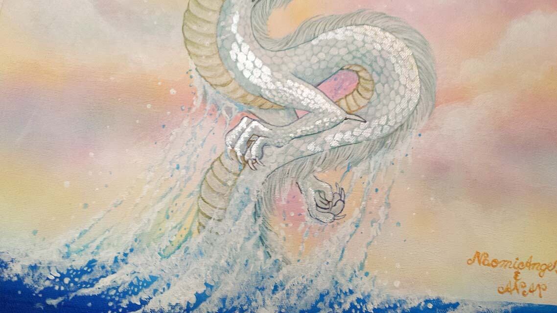 今回、龍宮神様を描くにあたって、ビジョンを授けていただけるようにお願いしましたら、この絵のように海からどーんと水しぶきをあげて飛び出し、七色の美しい空へ昇天する姿を見せていただき、その時の私は、龍神様のその飛び出したときのエネルギーのすさまじさで、体が前後に揺れたほどでした。